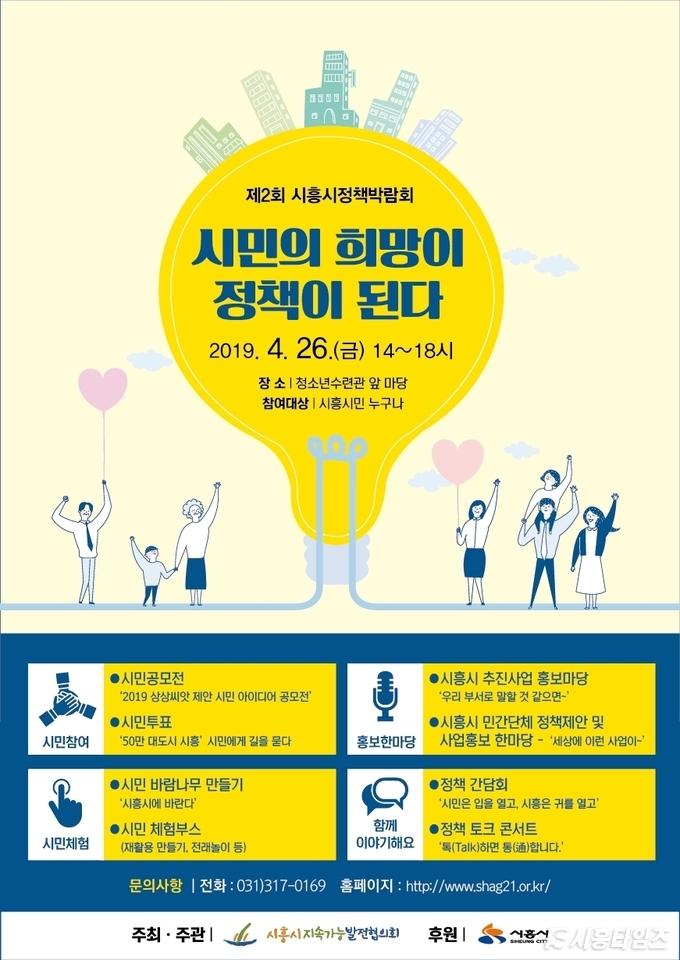 시흥시지속가능발전협의회(공동회장 허경애, 김영준. 김태경, 윤용철, 임병택)가 오는 4월 26일(금) 청소년 수련관앞마당에서 제 2회 정책박람회를 개최한다.“시민의 희망이, 시흥시의 정책이 된다”라는 주제로 진행되는 이번 정책박람회는 2018년에 이어 2번째 개최되는 정책을 주제로 진행되는 박람회로 시민참여에 의한 시민중심의 시정을 추진하기 위한 목적으로 진행된다.
