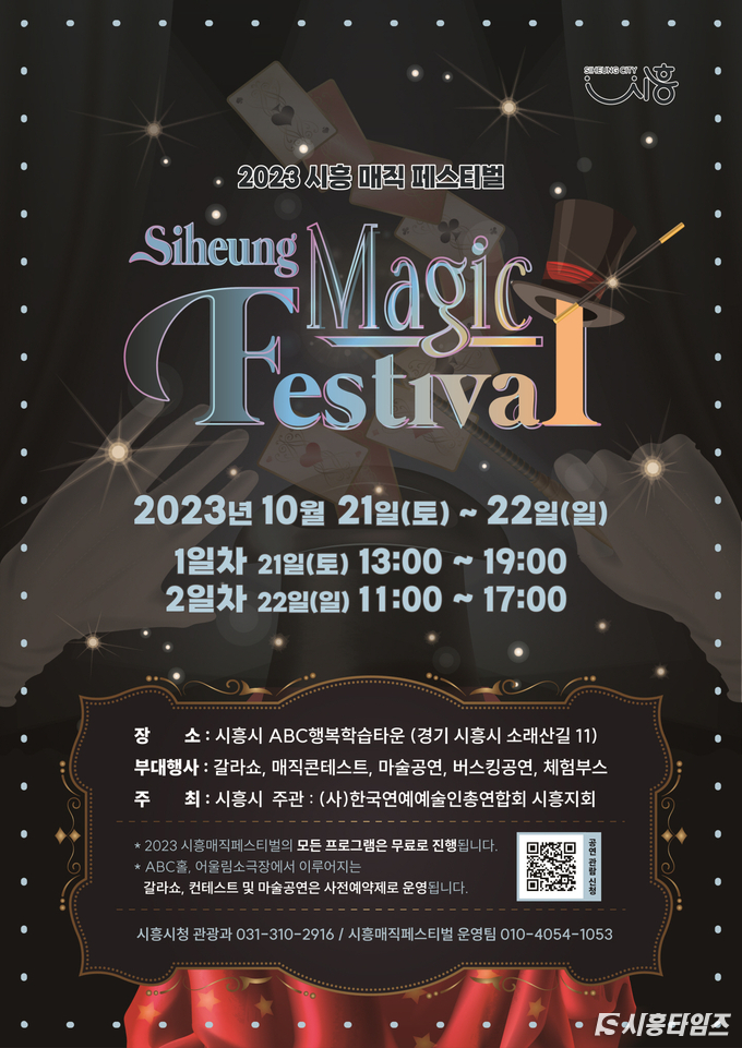 [시흥타임즈] 시흥시(시장 임병택)가 지역특화 관광 축제 지원 사업 공모에 당선된 ‘2023 시흥 매직 페스티벌’이 21일부터 22일까지 이틀간 대야동 ABC 행복학습타운에서 개최된다.‘2023 시흥 매직 페스티벌’은 ABC 행복학습타운의 ABC홀 대극장, 어울터, 어울림소극장 등 곳곳에서 아이와 가족이 함께 참여할 수 있는 즐길거리를 제공한다. 매직 갈라쇼, 매직 콘테스트, 마술공연, 거리 공연 등을 즐길 수 있으며 체험 부스와 딜러 부스가 마련돼 있다.