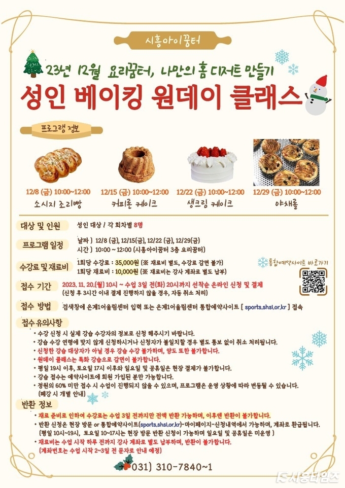 [시흥타임즈] 배움ㆍ놀이ㆍ돌봄이 어우러진 열린 문화 공간인 시흥아이꿈터(시흥시 은계로 240, 은계1어울림센터 3~4층)에서는 ‘성인을 위한 나만의 홈 디저트 만들기’ 베이킹 원데이 클래스 참여자를 모집하고 있다. 베이킹 원데이 클래스는 12월 한 달간 총 4회에 걸쳐 진행되며 회차별로 8명씩 모집한다. 회차별 프로그램은 ▲소시지 조리빵(12월 8일) ▲커피론 케이크(12월 15일) ▲ 생크림 케이크(12월 22일) ▲야채롤(12월 29일)이다. 오는 크리스마스와 연말연시를 맞아 친구, 가족을 위한 홈 파티를 계획하고 있다면 수강을 서두르는 게 좋다.