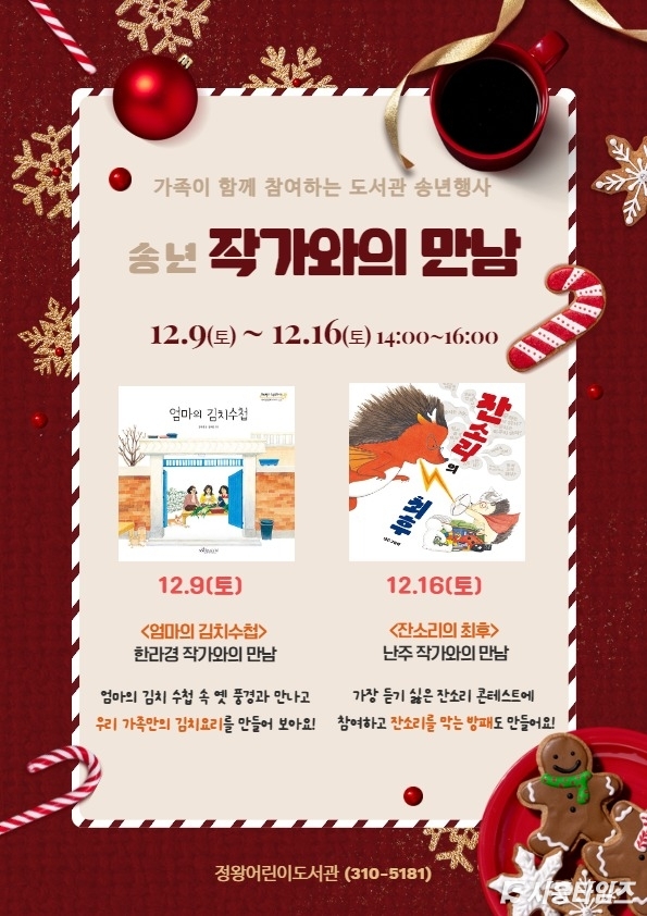 [시흥타임즈] 정왕어린이도서관은 야외활동이 줄어드는 겨울철, 어린이와 가족이 함께 참여하는 송년 행사로 그림책 작가와의 만남을 마련했다. 오는 12월 9일과 16일 각각 「엄마의 김치 수첩」의 한라경 작가, 「잔소리의 최후」 난주 작가를 초청해 2시간가량의 강연이 진행된다.강연을 통해 작가로부터 직접 그림책 창작과정에 대해 듣고 다양한 연계 활동으로 작품의 이해도를 높일 수 있는 시간이 마련된다. 참가자들은 강의를 통해 ‘때로는 잔소리로 때로는 따스한 옛이야기로 안아주는 엄마’란 존재에 대해 생각해볼 수 있다.
