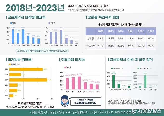 [시흥타임즈] 시흥시(시장 임병택)는 시흥시노동자지원센터가 ‘노동권익 서포터즈’ 활동을 통해 편의점 등 프랜차이즈 사업장 926개를 대상으로 노동환경 실태조사를 완료했다고 지난 22일 밝혔다. 앞서 지난 4월, 5명의 서포터즈를 선발하고 10월까지 총 6개월간 관내 편의점, 제과점, 커피전문점, 패스트푸드점 등 단시간 노동이 주로 이뤄지는 소규모 프랜차이즈 업종을 대상으로 1대1 대면조사 방식으로 진행했다. 총 1,261명의 근로자와 242명 사업주의 실태조사가 이뤄졌다.