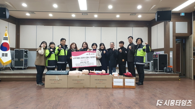 [시흥타임즈] 대야동 행정복지센터(동장 김근선)는 관내 업체인 노다지 복권방, 신호모터스, 우일자동차가 지난 17일 대야동 자율방범대에 심폐소생술 장비를 후원했다고 밝혔다.후원한 장비는 자동심장충격기 4대, 심폐소생술마네킹 4개, 영아심폐소생술인형 4개, 기도폐쇄조끼 1개 등 510만 원 상당의 물품이다.