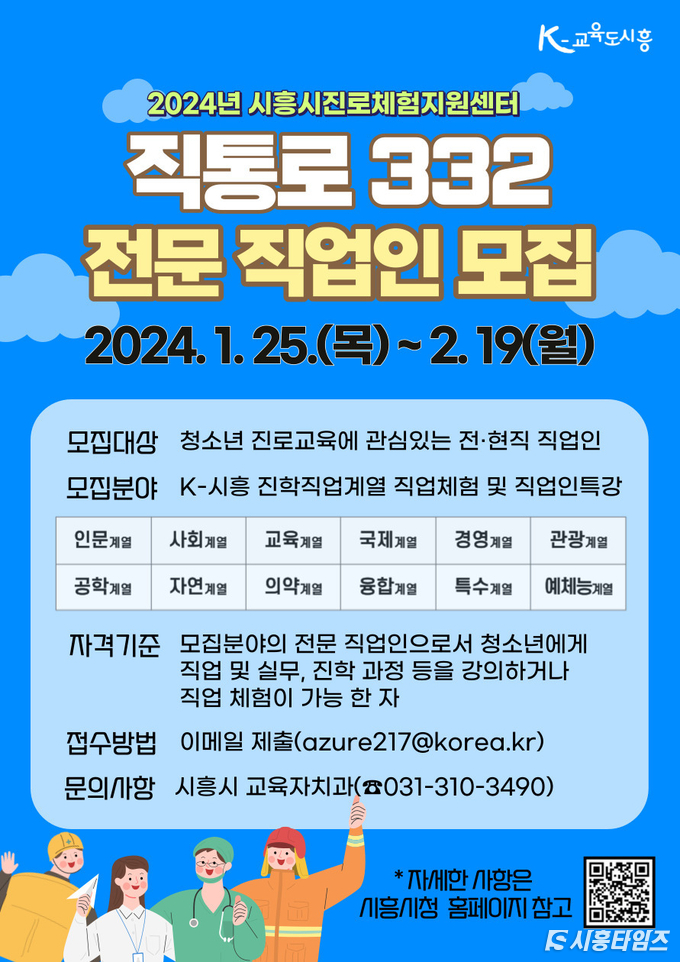 [시흥타임즈] 시흥시(임병택 시장)는 관내 청소년들이 소질과 적성을 바탕으로 직업 세계를 이해하고, 진로를 탐색ㆍ설계할 수 있도록 지원하기 위해 ‘직통로 332(직업으로 통하는 진로 332)’의 전문 직업인 멘토를 2월 19일까지 모집한다. ‘332’는 시흥시 행정조직 내 있는 부서의 총 332개 팀 수를 의미한다.모집 분야는 교육부 국가진로교육센터 진로정보망 커리어넷 전공계열과 고용노동부 한국고용정보원 워크넷 직업계열을 준용해 시흥시가 개발한 ‘K-시흥 진학직업계열’로 인문, 사회, 교육, 국제, 경영, 관광, 공학, 자연, 의약, 융합, 특수, 예체능 12 계열이다.