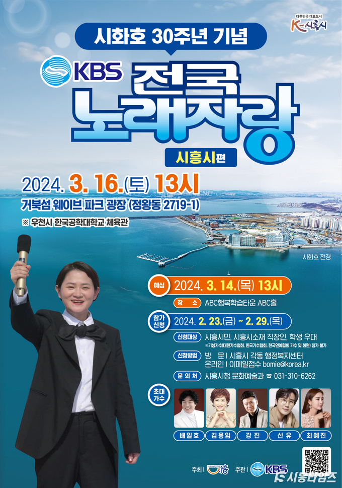 [시흥타임즈] 시흥시가 오는 3월 16일 오후 1시에 시흥 거북섬 웨이브파크 광장(정왕동 시화MTV 88호 문화공원 일원)에서 국내 최장수 예능프로그램인 ‘KBS 전국노래자랑’을 개최한다.이번 행사는 환경오염을 극복하고, 생명의 호수로 탄생한 ‘시화호 30주년’을 기념하고, 시민 화합과 문화 향유의 장을 제공하고자 추진된다.