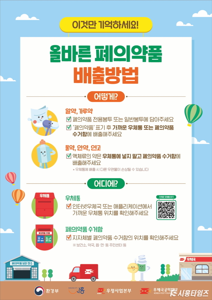 가정에서 발생한 폐의약품은 회수 봉투나 일반 편지 봉투에 ‘폐의약품’이라고 표시해 밀봉한 후 가까운 우체통에 넣으면 된다. 우체국이 이를 회수해 시흥시청에 전달하면 안전하게 처리된다. 다만, 액상 의약품은 우편물 훼손 우려가 있어 기존 보건소나 행정복지센터 전용 수거함을 이용해야 한다.