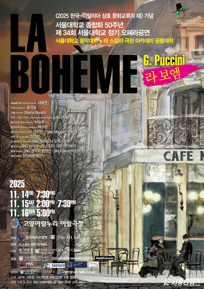 [시흥타임즈] 시흥시(시장 임병택)와 서울대 교육협력사업인 ‘스누콤 합창단’이 ‘2025 한국-이탈리아 상호 문화교류의 해’를 기념해 서울대 음악대학과 라 스칼라 극장 아카데미가 공동으로 제작하는 오페라 ‘라 보엠(La Boheme)’에 특별출연한다.이번 공연은 SNU오페라센터장인 서혜연 서울대학교 성악과 교수가 예술총감독을 맡았으며, 홍석원 서울대학교 작곡과 교수가 지휘를, 이탈리아 출신 마리나 비앙키(Marina Bianchi)가 연출을 담당한다. 양국을 대표하는 음악교육 기관의 협력을 바탕으로 청년 예술가들이 주체적으로 참여해, 문화적 교류와 예술적 성장을 이루는 수준 높은 무대를 선보일 예정이다.