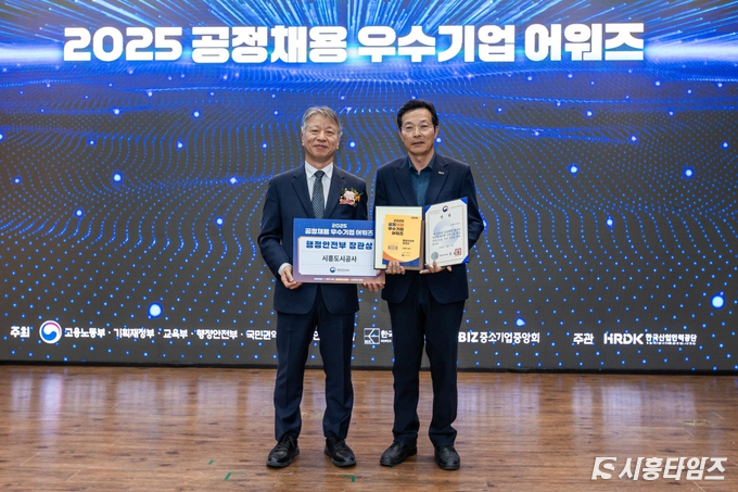 [시흥타임즈] 시흥도시공사(사장 유병욱, 이하 공사)는 지난 7일 ‘2025년 공정채용 우수기업 어워즈’ 시상식에서 공공기관 부문 우수기관으로 선정되어 행정안전부 장관상을 수상했다.‘2025년 공정채용 우수기업 어워즈’는 고용노동부가 주관하고 관계부처가 공동으로 참여해 공정채용 실천 노력을 평가하는 제도이다. 선정 기관에는 공정채용 지원사업 우선 지원, 정기근로감독 면제, 조달청 입찰 시 가점 부여 등의 혜택이 주어진다.