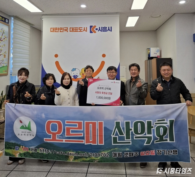 [시흥타임즈] 시흥시 매화동 오르미 산악회는 지난 11월 10일 매화동 행정복지센터(동장 김기세)를 방문해 지역 내 저소득 취약계층을 위한 후원금 100만 원을 전달했다.오르미 산악회는 지난 2011년 창단 이후 혁신적인 마음가짐으로 매년 봉사와 기부 활동을 펼쳐온 단체로, 저소득 청소년을 위한 장학금 지원 사업, 독거 어르신 주거환경 개선 사업 등 지역 내 취약계층 지원 및 이웃 사랑 실천에 꾸준히 앞장서 왔다. 이번에 전달된 후원금은 매화동 지역사회보장협의체 기금으로 기탁돼 관내 취약계층의 복지서비스 지원을 위해 사용될 예정이다.