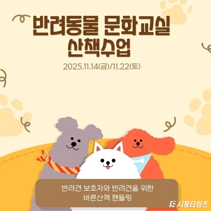 [시흥타임즈] 시흥시(시장 임병택)는 오는 11월 14일과 22일 반려동물과 함께하는 문화교실(산책 수업)을 운영한다. 이번 프로그램은 시흥시에 동물 등록이 완료된 반려견을 양육하는 시민을 대상으로 진행되며, 수업별 30마리씩 선착순 모집한다.11월 14일에는 배곧 한울공원 반려견 놀이터에서 2회 진행하고, 22일에는 시흥시 농업기술센터 잔디광장에서 2회 진행한다. 시흥시에 반려동물로 등록된 맹견을 제외한 모든 반려견이 참여할 수 있으며, 반려견과 함께 즐거운 산책을 할 수 있도록 올바른 산책 방법과 산책 예절 교육으로 반려견의 사회성을 높일 수 있도록 수업을 기획했다.