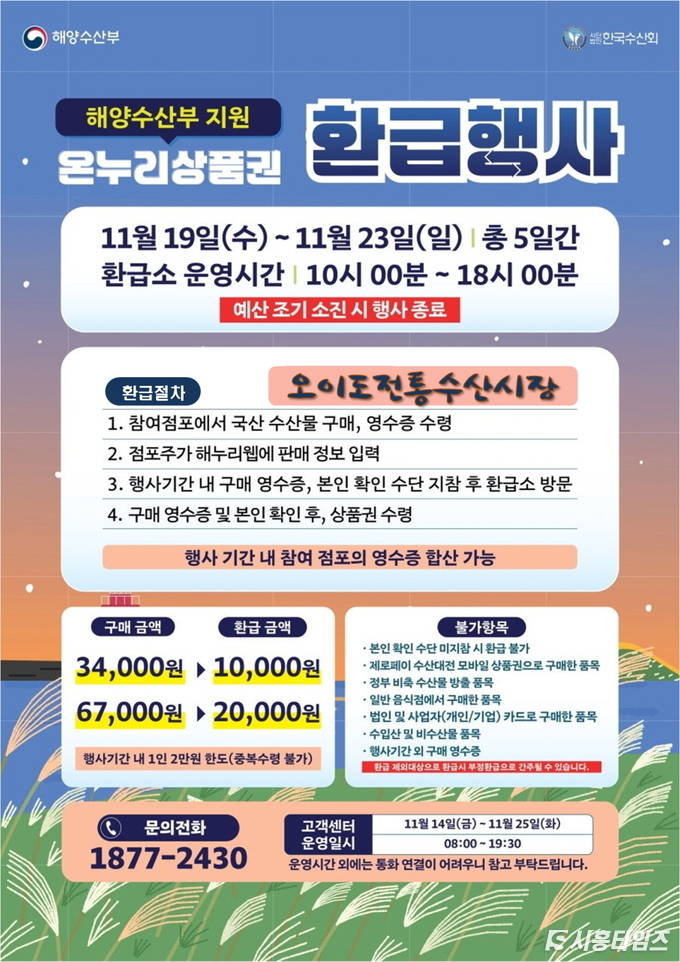 [시흥타임즈] 시흥시(시장 임병택)는 가을철을 맞아 수산물 체감물가 안정과 소비 활성화를 위해 오이도전통수산시장에서 ‘온누리상품권 환급 행사’를 11월 19일부터 23일까지 5일간 진행한다. 이번 행사는 전통시장 소비 촉진과 물가 안정 지원을 위해 마련됐다.