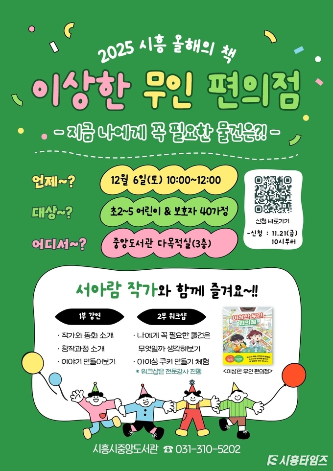 [시흥타임즈] 시흥시중앙도서관이 ‘2025 시흥 올해의 책’ 어린이 분야 선정 도서인 「이상한 무인 편의점」의 서아람 작가 초청 강연을 오는 12월 6일 오전 10시부터 중앙도서관 다목적실에서 운영한다.올해의 책 독서문화 확산을 위해 마련된 이번 행사는 어린이 독자들이 작품 속에 갈등·용기·성장의 메시지를 깊이 이해하고 독서의 즐거움을 넓힐 수 있도록 기획됐다.