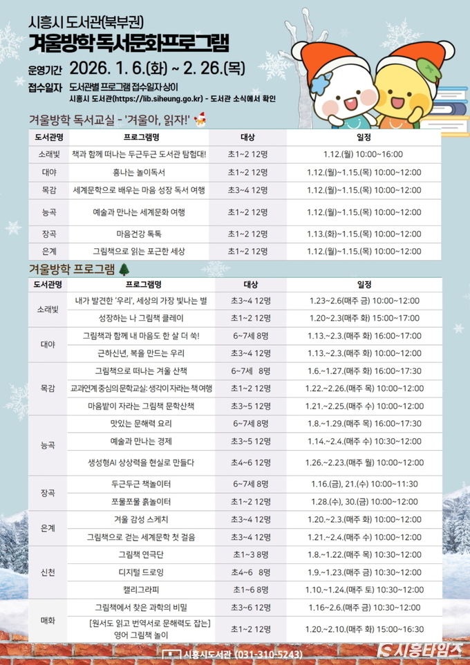 [시흥타임즈] 시흥시(시장 임병택)는 겨울방학을 맞아 북부권 8개 공공도서관(소래빛ㆍ대야ㆍ목감ㆍ능곡ㆍ장곡ㆍ은계ㆍ신천ㆍ매화)에서 1월 6일부터 2월 26일까지 겨울독서교실 및 겨울방학 프로그램을 운영한다.이번 프로그램은 관내 초등학생과 유아 272명을 대상으로 진행되며, 책을 기반으로 창의적 탐구와 독서 습관 형성에 도움을 주는 25개의 다채로운 강좌로 구성됐다.