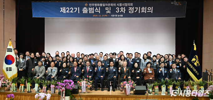 [시흥타임즈] 민주평화통일자문회의 시흥시협의회가 제22기 임기의 공식 출범을 알리고 평화통일 공감대 확산을 위한 본격적인 활동에 돌입했다. 협의회는 지난 27일 시청 늠내홀에서 ‘제22기 시흥시협의회 출범식 및 협의회장 이취임식’과 ‘2025년 정기회의’를 개최했다.이날 행사에는 자문위원 101명을 비롯한 내빈 등 130여 명이 참석해, 새로운 임기 시작을 축하하고 지역사회 대화 활성화를 위한 협의회의 역할 확대에 기대를 모았다.
