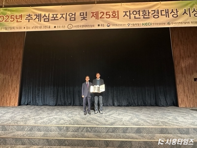 [시흥타임즈] 시흥시가 지난 27일 서울 양재동 aT센터에서 열린‘2025년 제25회 자연환경대상 기후에너지환경부장관상’ 최우수상을 받았다. 자연환경대상은 기후에너지환경부와 한국생태복원협회가 주관하는 국내 생태복원 분야 최고 권위의 시상으로, 생태복원ㆍ서식지 조성ㆍ환경정책 등 전반에서 우수한 기관을 선정한다.
