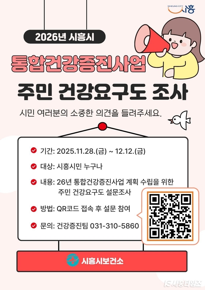 [시흥타임즈] 시흥시(시장 임병택)는 2026년 지역사회 통합건강증진사업 계획 수립을 위해 오는 12월 12일까지 지역 주민을 대상으로 보건의료서비스 전반에 관한 주민 건강요구도 조사를 실시한다.