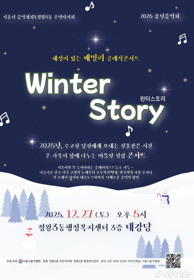 [시흥타임즈] 시흥시음악협회는 정왕3동 주민자치회와 협력해 오는 12월 27일 오후 5시, 정왕3동 행정복지센터 3층 대강당에서 2025 송년 음악회 ‘해설이 있는 패밀리 클래식 콘서트, 윈터 스토리’를 개최한다.