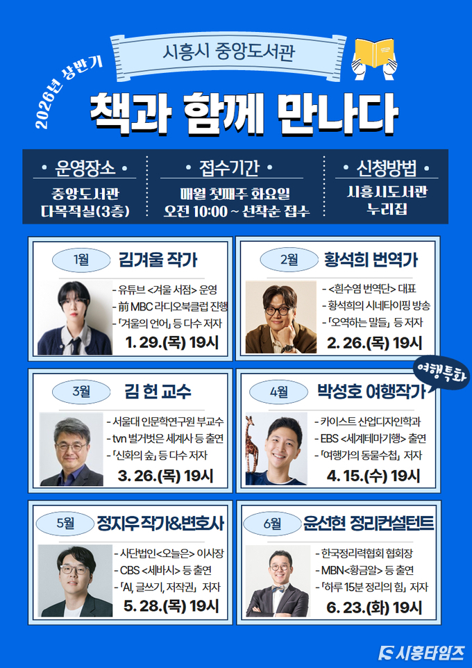 [시흥타임즈] 시흥시중앙도서관은 2026년 상반기 시민의 독서문화 향유 기회 확대와 인문적 소양 강화를 위해 운영하는 저자강연 ‘책과 함께 만나다’ 강연 출연진을 공개했다.이번 상반기 ‘책과 함께 만나다’ 작가 강연에는 ▲북튜버이자 작가로 활동 중인 김겨울(1월 29일 19시) ▲영화 번역가 황석희(2월 26일 19시) ▲고전 인문학자이자 교수 김헌(3월 26일 19시) ▲여행작가 박성호(4월 15일 19시) ▲변호사이자 작가 정지우(5월 28일 19시) ▲정리컨설턴트 윤선현(6월 23일 19시)이 참여한다. 중앙도서관 다목적실에서 2시간가량 진행되는 각 강연은 저자의 대표 도서와 경험을 바탕으로 한 주제 강연과 질의응답으로 구성된다.