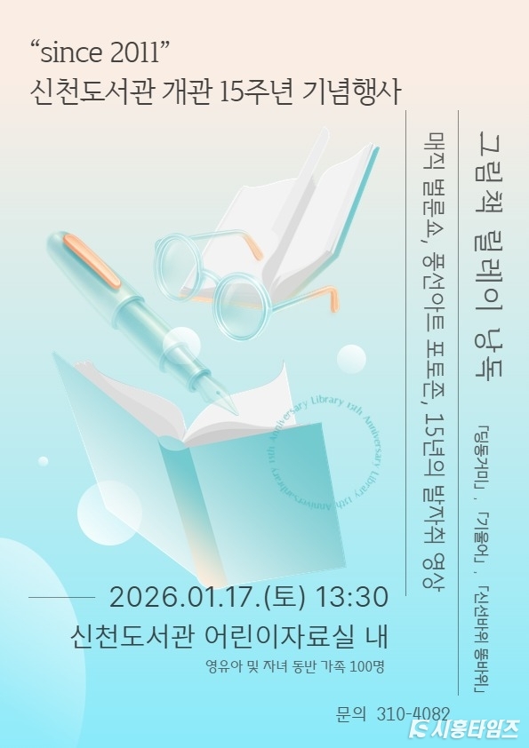 [시흥타임즈] 시흥시(시장 임병택)는 오는 1월 17일 신천도서관에서 ‘개관 15주년 기념행사’를 열고, 유아동 및 어린이 동반 가족 100여 명을 대상으로 그림책 낭독과 마술 공연을 운영한다. 행사는 이날 오후 1시 30분부터 3시 30분까지 진행된다.