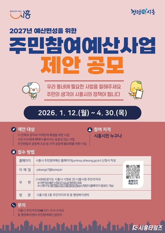 공모 관련 궁금한 사항은 시흥시 주민자치과(031-310-3183)나 각 동 행정복지센터 주민참여예산 담당자에게 문의하면 된다.