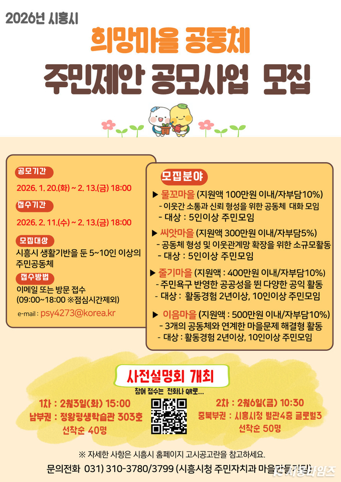 [시흥타임즈] 시흥시는 주민이 주도하는 마을공동체 활성화를 위해 ‘2026년 시흥시 희망마을공동체 주민제안 공모사업’을 추진하고, 시민들의 이해를 돕기 위한 권역별 사전설명회를 다음 달 남부권과 중ㆍ북부권으로 나눠서 개최한다.관련 사업은 이웃 간 소통과 협력을 바탕으로 주민 스스로 지역문제를 해결하고, 지속 가능한 마을공동체를 형성할 수 있도록 지원하는 사업이다. 시는 주민들의 자발적인 참여와 창의적인 아이디어를 통해 다양한 마을공동체 활동이 발굴될 것으로 기대하고 있다.