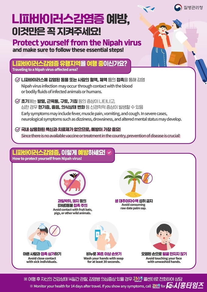 니파바이러스는 동물(과일박쥐ㆍ돼지 등)과 접촉하거나 오염된 식품(대추야자 수액 등)을 섭취하면 감염될 수 있으며, 환자의 체액과 밀접 접촉 시 사람 간 전파도 가능하다. 감염 초기에는 발열, 두통, 근육통이 나타나며 현기증, 졸음, 의식 저하 등 신경계 증상 및 중증으로 악화해 사망에 이를 수 있어 주의가 필요하다.