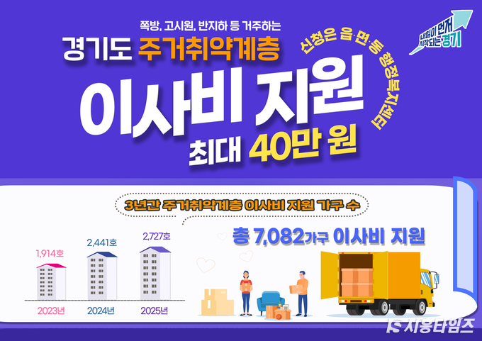 [시흥타임즈] 경기도가 쪽방, 고시원, 반지하 등 열악한 주거환경에 거주하고 있는 주거취약계층의 안정적 이주를 위해 올해도 ‘주거취약계층 이사비 지원사업’을 이어간다.지원 대상은 주거상향 지원사업을 통해 공공임대주택 이주가 결정돼 계약을 완료한 가구, 주거취약계층 이주지원 버팀목 대출을 활용해 민간임대주택으로 이주한 경우다.