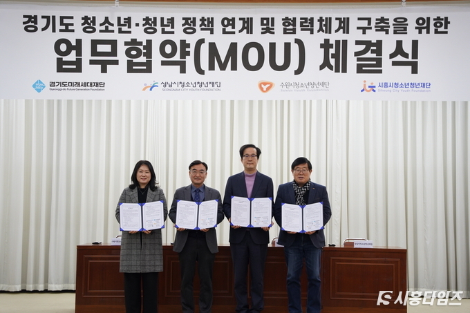 [시흥타임즈] (재)시흥시청소년청년재단은 지난 12일 경기도청 옛청사 신관 4층 대회의실에서 경기도미래세대재단, 수원시청소년청년재단, 성남시청소년청년재단과 함께 ‘청소년ㆍ청년 정책 연계 및 협력체계 구축’을 위한 업무협약을 체결했다.이번 협약은 청소년청년재단으로 확대ㆍ전환된 시흥ㆍ수원ㆍ성남시청소년청년재단과 경기도미래세대재단이 청소년기에서 청년기로 이어지는 성장 과정을 하나의 정책 흐름으로 연결하고, 기관 간 협력을 통해 청년 정책의 실행력과 확장성을 높이기 위해 마련됐다.