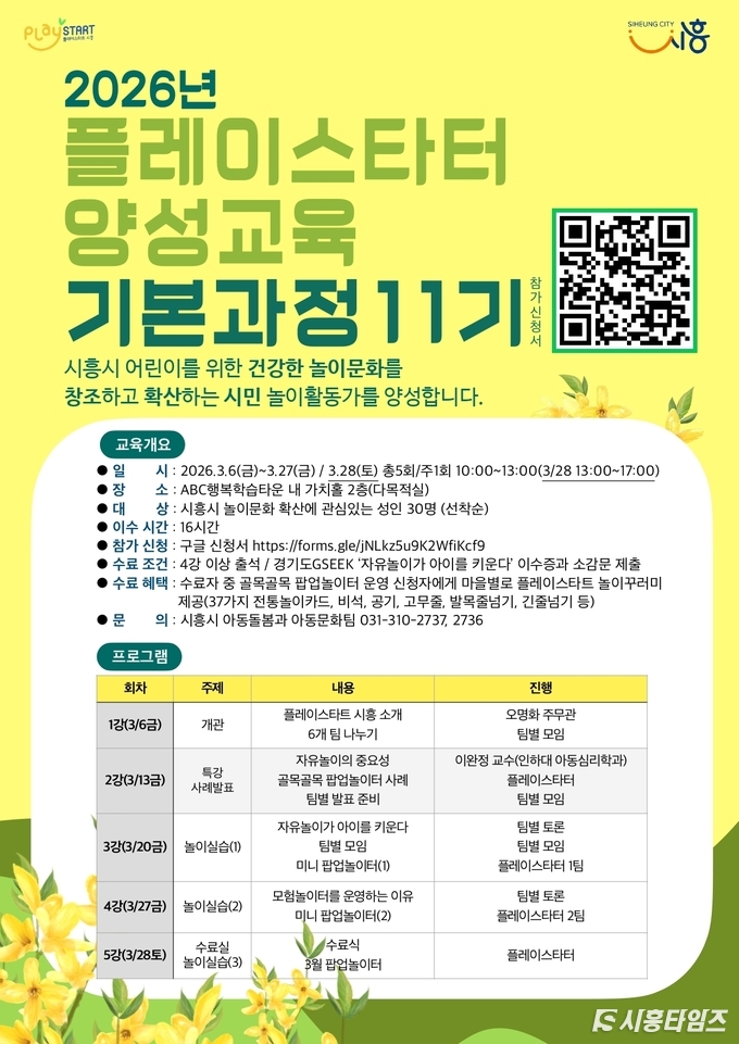 교육은 3월 6일부터 28일까지 총 5회에 걸쳐 시흥ABC행복학습타운 가치홀 다목적실에서 진행된다. 시흥시 놀이문화 확산에 관심 있는 성인 30명을 선착순으로 모집하며, 홍보물의 정보무늬(큐알코드)에 접속한 뒤 구글 신청서를 통해 신청할 수 있다.