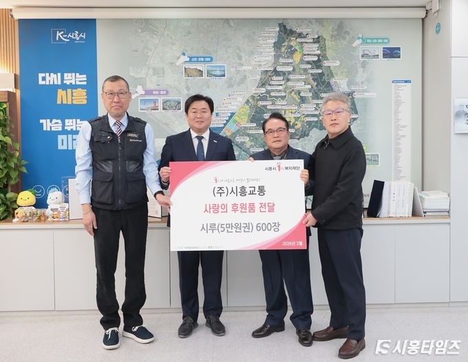 [시흥타임즈] 시흥시(시장 임병택)는 지난 2월 26일 ㈜시흥교통에서 저소득층 지원을 위해 시루 5만 원권 600여 장을 시흥시1%복지재단에 전달했다고 밝혔다.이날 전달식에 참여한 ㈜시흥교통은 시흥시 청룡저수지길에 본사를 둔 지역 대표 버스운수업체로, 시내·마을·광역버스 등 다양한 노선을 운영하며 시민들의 일상적 이동을 책임지고 있다. 2003년 개업 이후 꾸준히 운송 기반 시설을 확대해 현재 47개 노선과 273대의 차량을 운영하고 있으며, 지역 내 통근·통학 교통망 안정화에 중요한 역할을 맡고 있다.