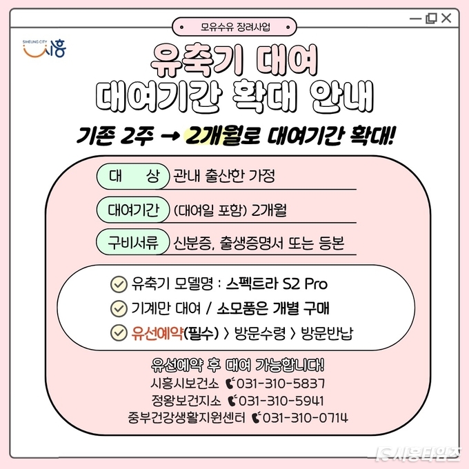 유축기 대여 신청 및 자세한 사항은 시흥시보건소(031-310-5837), 정왕보건지소(031-310-5941), 중부건강생활지원센터(031-310-0714)로 문의하면 된다.