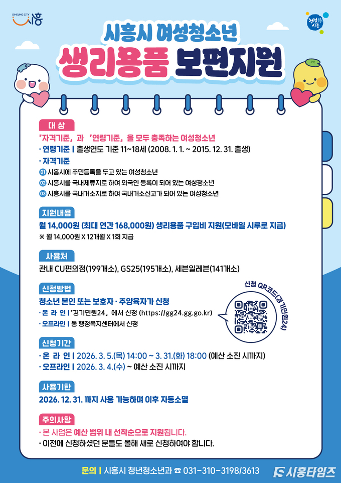 [시흥타임즈] 시흥시가 4일부터 여성청소년의 건강권 증진을 위해 ‘여성청소년 생리용품 보편지원 사업’ 신청을 받는다. 경기도와 함께하는 이번 사업은 생리용품 구매 비용을 지역화폐(모바일 시루)로 지원하는 것으로, 1인당 월 14,000원(연 최대 168,000원)을 지급한다.