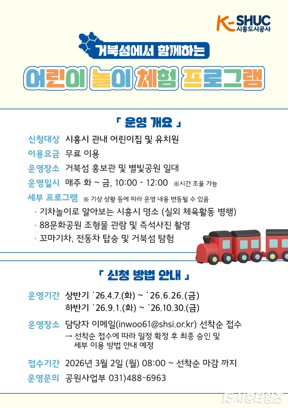 [시흥타임즈] 시흥도시공사가 오는 4월부터 거북섬 일대에서 관내 어린이집 및 유치원을 대상으로 ‘거북섬과 함께하는 어린이 놀이 체험 프로그램’을 운영한다고 밝혔다.이번 프로그램은 기존 운영성과와 만족도 조사 결과를 반영해 실내·야외 활동을 연계한 순환형 체험 프로그램으로 구성됐다. 단순 탑승형 콘텐츠 제공에서 벗어나 놀이와 학습 요소를 결합해 어린이들이 시흥의 지역 명소인 거북섬을 자연스럽게 이해하고 체험할 수 있도록 교육적 기능을 강화했다.