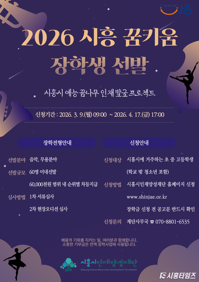 [시흥타임즈] 시흥시인재양성재단은 지역 내 예능 분야 인재를 발굴ㆍ육성하기 위해 ‘2026년 시흥 꿈키움 장학생’을 60명 이내로 선발한다.