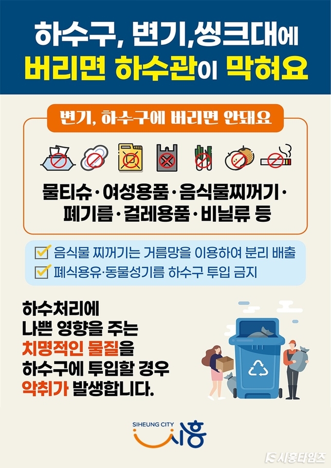 [시흥타임즈] 시흥시(시장 임병택)는 화장실 변기나 하수구에 버려지는 물티슈와 여성용품, 음식물 찌꺼기, 폐식용유 등이 하수관로와 오수처리시설을 막아 각종 문제를 일으킬 수 있다며 시민들의 주의를 당부했다.이러한 생활 쓰레기가 하수관로로 유입되면, 하수 역류와 악취 발생은 물론 맨홀 펌프장 고장, 하수처리장 운영 차질 등으로 이어져 막대한 행정력과 예산 낭비를 초래할 수 있다.