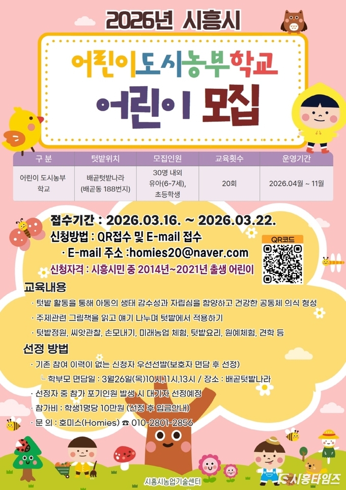 [시흥타임즈] 시흥시(시장 임병택)는 어린이들에게 생명농업 자원을 활용한 자연친화적 농업 체험 기회를 제공해 유년기 건강한 성장을 돕기 위한 ‘2026년 어린이 도시농부학교’를 4월부터 11월까지 배곧텃밭나라에서 운영한다.이번 사업은 텃밭 활동을 통해 아동의 생태 감수성과 자립심을 키우고 건강한 공동체 의식을 형성할 수 있도록 마련됐다. 교육은 유아(6~7세)와 초등학생을 대상으로 약 30명 내외를 선발해 총 20회 과정으로 진행된다.
