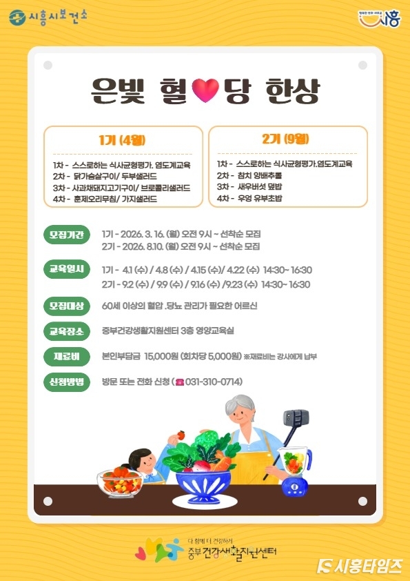[시흥타임즈] 시흥시보건소 중부건강생활지원센터는 고혈압과 당뇨 관리가 필요한 어르신의 건강한 식생활 실천을 돕기 위해 영양교육 프로그램 ‘은빛 혈당 한상’을 4월 1일부터 센터 영양교육실에서 운영한다.