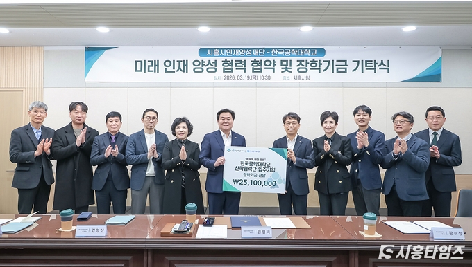 [시흥타임즈] 시흥시인재양성재단이 지난 19일 시청 다슬방에서 한국공학대학교와 지역인재 장학사업 추진을 위한 업무협약을 체결하고, 산학협력단 내 입주기업들이 조성한 장학기금 총 2,510만 원의 기탁식을 진행했다.이날 행사에는 (주)릴리아 솔루션, 피티에스와이에스, 메타리버테크놀러지, 엠씨테크닉스, 태성 등 5개 입주기업 대표를 비롯해 시 관계자와 한국공학대학교 총장 등 10여 명이 참석해 지역 인재 양성을 위한 협력 의지를 다졌다.