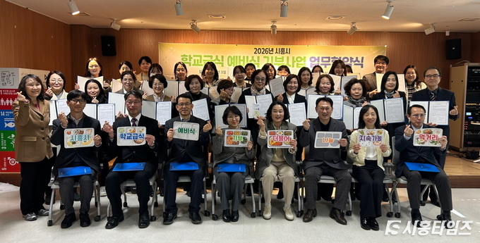 [시흥타임즈] 시흥시(시장 임병택)는 지난 3월 20일 능곡어울림센터 3층 다목적실에서 ‘학교급식 예비식 기부사업’ 업무협약을 체결하고 사업 확대 추진에 나선다.이번 협약식에는 시흥시를 비롯해 시흥교육지원청, 학교급식지원센터, 관내 초중고 27개 학교, 7개 복지기관(작은자리종합사회복지관ㆍ시흥시목감종합사회복지관ㆍ시흥시정왕종합사회복지관ㆍ오이도문화복지센터ㆍ경기시흥남부지역자활센터ㆍ행복마을월곶ㆍ거모2통경로당) 관계자 등이 참석해 사업의 안정적 운영과 협력 강화를 약속했다.