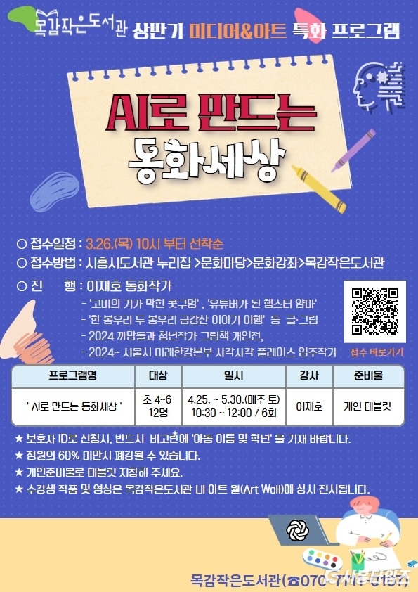 [시흥타임즈] 시흥시 목감2어울림센터 2층에 있는 목감작은도서관은 ‘2026년 상반기 미디어ㆍ아트 특화 프로그램’의 하나로 초등학교 4~6학년을 대상으로 한 융합형 창작 프로그램 ‘인공지능으로 만드는 동화 세상’을 오는 4월 25일부터 5월 30일까지 총 6회 과정으로 운영한다.이번 프로그램은 디지털 드로잉과 인공지능(AI) 도구를 활용해 어린이들이 직접 이야기를 만들고 그림을 그려 자신만의 그림책을 완성하는 창작 활동으로 구성됐다. 참여 학생들은 이야기 구상부터 캐릭터 만들기, 디지털 그림 제작, 책 구성까지 전 과정을 경험하며 창의력과 표현력을 키우고, 자신만의 동화책을 만들게 된다.