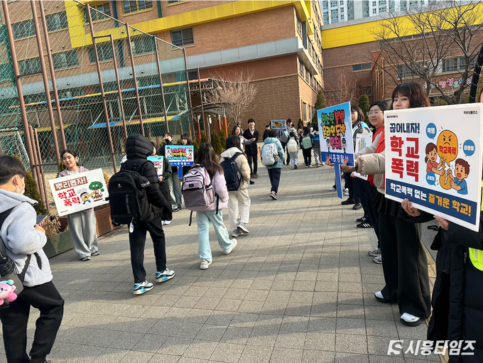 이날 캠페인에서는 학생자치회 학생들도 적극 동참해 ‘끊어내자 학교폭력’ ‘뿌리뽑자 학교폭력’ 등의 메시지가 담긴 피켓을 들고 구호를 외치며 학생들의 관심을 독려했다.