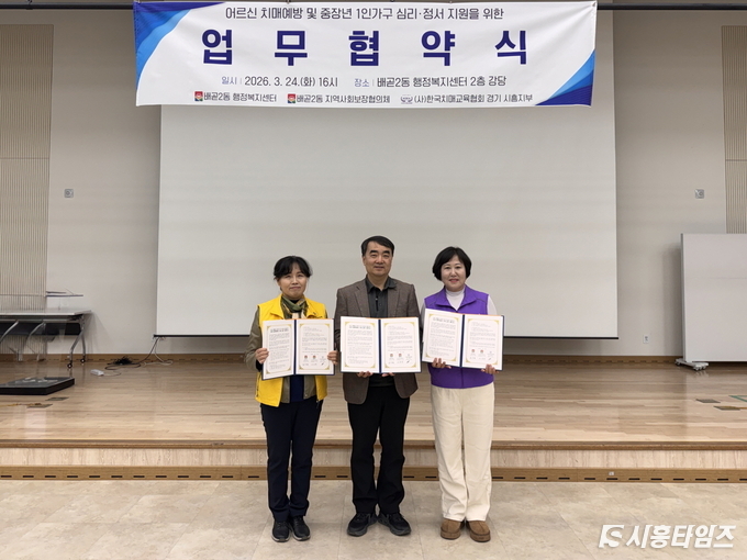 협약에 따라 배곧2동 행정복지센터와 지역사회보장협의체는 위기가구 발굴과 맞춤형 프로그램 운영을 담당하고, (사)한국치매교육협회는 어르신 대상 치매예방 인지활동과 중장년 1인 가구 대상 전문 심리 상담을 지원한다.