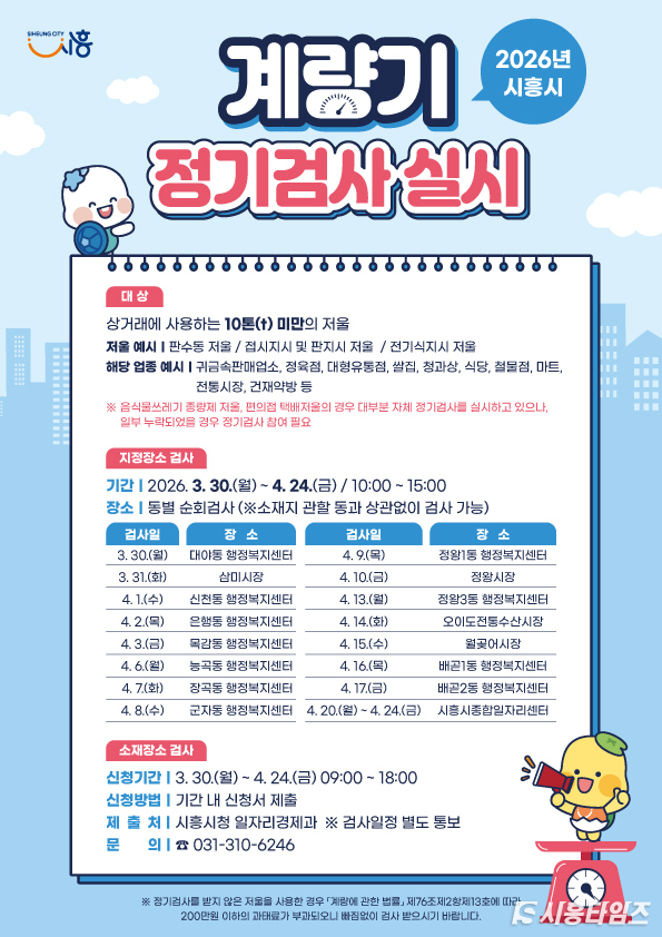 [시흥타임즈] 시흥시(시장 임병택)는 공정한 상거래 질서 확립과 소비자 권익 보호를 위해 오는 3월 30일부터 4월 24일까지 ‘2026년 계량기(저울) 정기 검사’를 실시한다.이번 정기 검사는 ‘계량에 관한 법률’에 따라 2년마다 시행되는 법정 검사로, 상거래용 저울의 정확성을 확보하기 위해 시행된다.