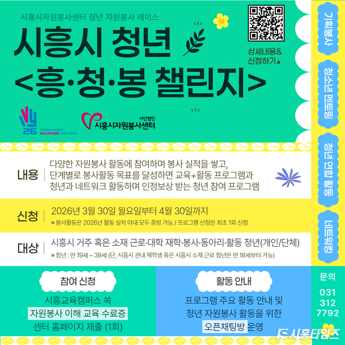 [시흥타임즈] 시흥시자원봉사센터는 청년들의 자발적인 자원봉사 참여 확대와 지속 가능한 참여 기반 조성을 위해 청년 자원봉사 레이스 ‘흥·청·봉 챌린지’를 4월부터 12월까지 운영한다.이번 프로그램은 봉사활동과 인정보상을 결합한 참여형 자원봉사 모델로, 시흥시 청년(만 19세~39세)과 관내 활동 청년을 대상으로 한다. 개인은 물론 청년 단체도 참여할 수 있다.