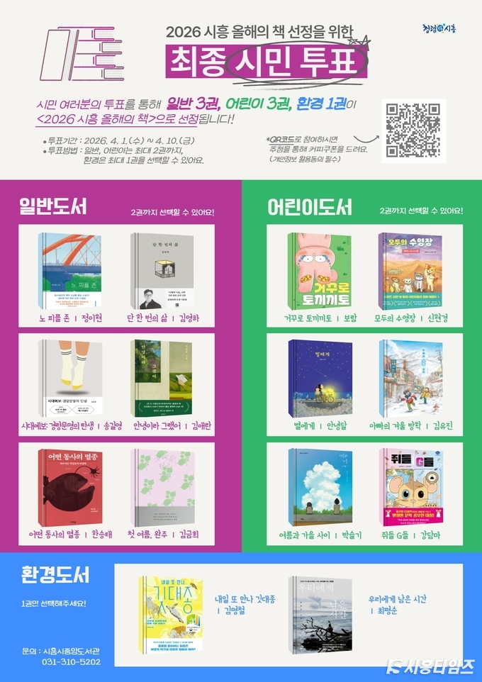 이번 시민 투표는 일반 6권, 어린이 6권, 환경 2권 등 총 14권을 대상으로 진행되며, 투표 결과를 반영해 최종 7권(일반 3권, 어린이 3권, 환경 1권)이 ‘2026 시흥 올해의 책’으로 선정된다.