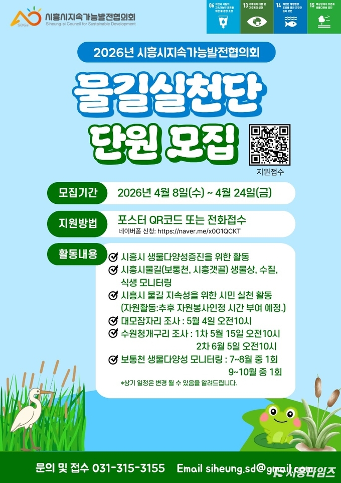 [시흥타임즈] 시흥시지속가능발전협의회(이하, 시흥시지속협)는 시흥시 물길(보통천ㆍ시흥갯골)의 생태 현황을 파악하고 시민들의 환경 인식을 높이기 위해 ‘2026년 물길실천단’ 단원 10명을 오는 4월 24일까지 모집한다.이번 활동은 시민이 직접 참여하는 자원 활동으로, 지역 물길의 생태 현황을 시민의 눈높이에서 파악하고 기록해 체계적인 관리 근거를 마련하기 위해 추진됐다.