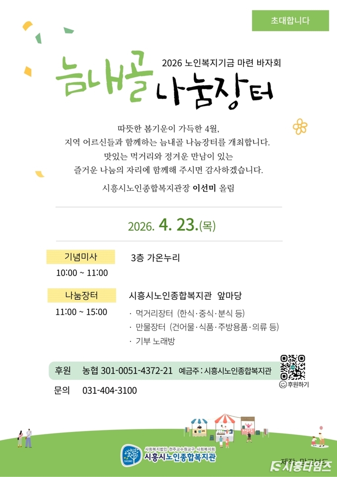 [시흥타임즈] 시흥시노인종합복지관(이하, 노인복지관)은 오는 4월 23일 오전 10시부터 지역 어르신과 주민이 함께 어우러지는 나눔의 장 ‘늠내골 나눔장터’를 노인복지관 앞마당에서 개최한다.