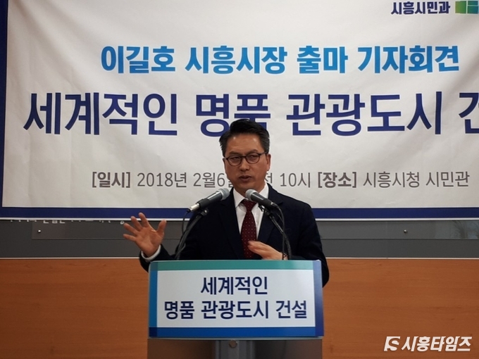 (시흥타임즈=우동완 기자) 더불어민주당 소속 시흥미래전략포럼 이길호(52) 대표가 6일 오전 시흥시청 시민관에서 기자회견을 열고 시흥시장 출마를 공식화 했다.이날 이길호 대표는 "6·13 시흥시장 선거에 출마해 세계적인 명품 관광도시를 건설하겠다"고 밝혔다.