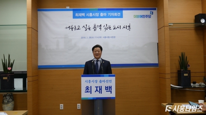 더불어민주당 최재백 경기도의원이 28일 시흥시장 출마를 공식 선언했다.최의원은 이날 시흥시청 시민관에서 기자회견을 통해 “머무르고 싶은 품격 있는 도시 시흥”을 만들기 위해 모든 신념과 의지를 다 바치겠다“며 출사표를 던졌다.