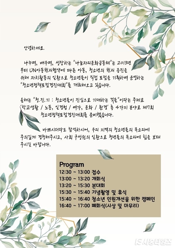[시흥타임즈] 아동·청소년의 권리 증진을 위해 7년째 이어오고 있는 ‘청소년정책포럼경진대회’가 오는 28일 시흥 ABC행복학습타운에서 개최된다. ‘나눔자리문화공동체’는 2013년부터 UN아동권리협약에 따른 아동, 청소년의 권리 증진을 위한 자치활동의 일환으로 청소년들이 직접 포럼을 기획하여 운영하는 '청소년정책포럼경진대회'를 개최해오고 있다.